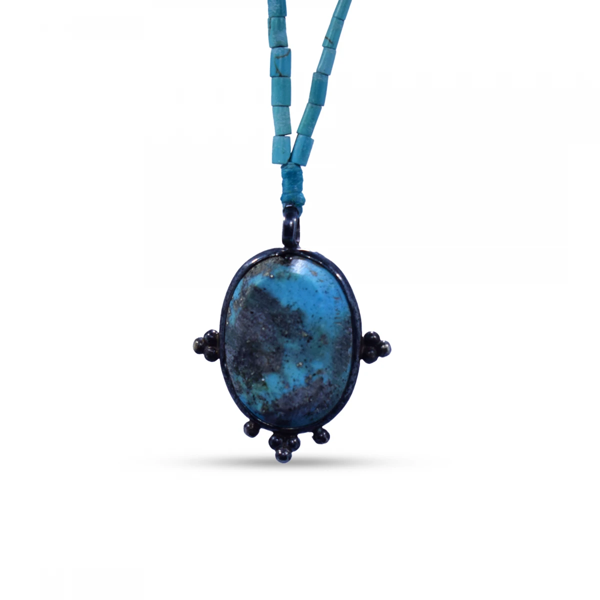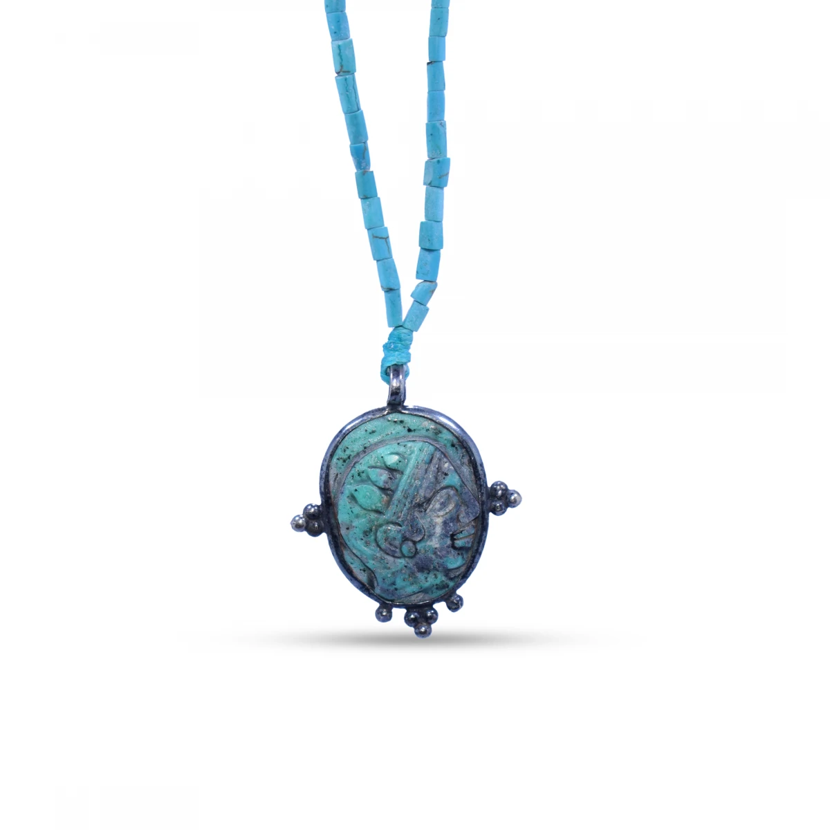 This unique necklace features a turquoise carved stone made using the antique lost wax casting technique, hand-molded in sterling silver. The chain is composed of hand-cut turquoise. This piece is one of a kind.