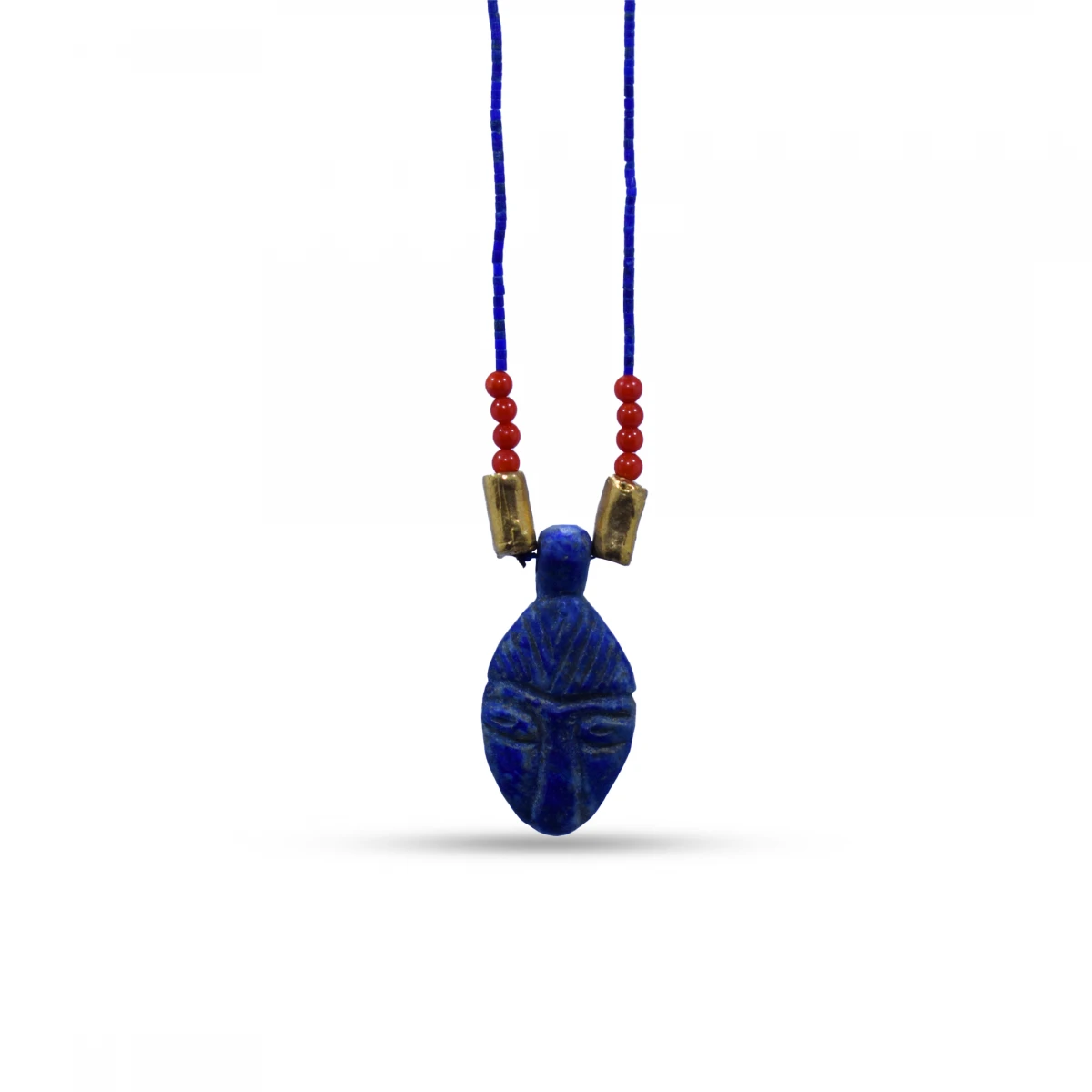 This unique necklace features a hand-carved lapis lazuli pendant, antique coral, and handmade bronze pieces. The chain is composed of handcrafted cut lapis lazuli.