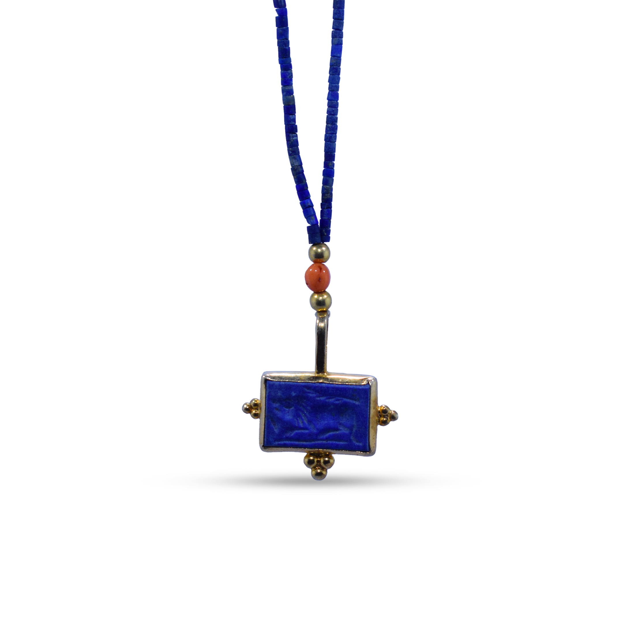 This unique necklace is made of a hand-engraved lapis lazuli stone featuring an emblem of a walking lion, along with antique coral and handmade silver pieces. The chain is made of hand-cut lapis lazuli.