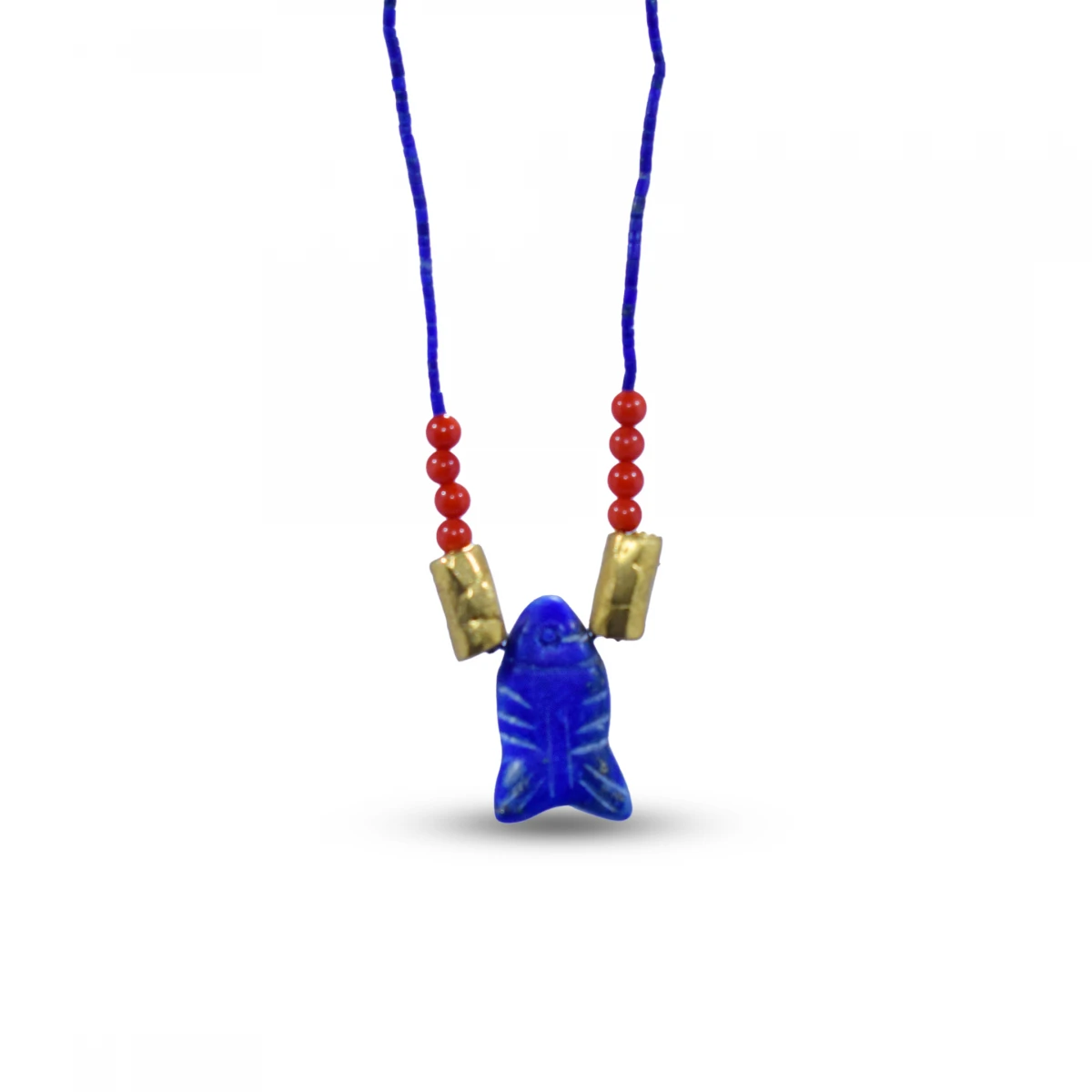 This unique necklace features a hand-carved lapis lazuli pendant, antique coral, and handmade bronze pieces. The chain is made of handcrafted cut lapis lazuli.