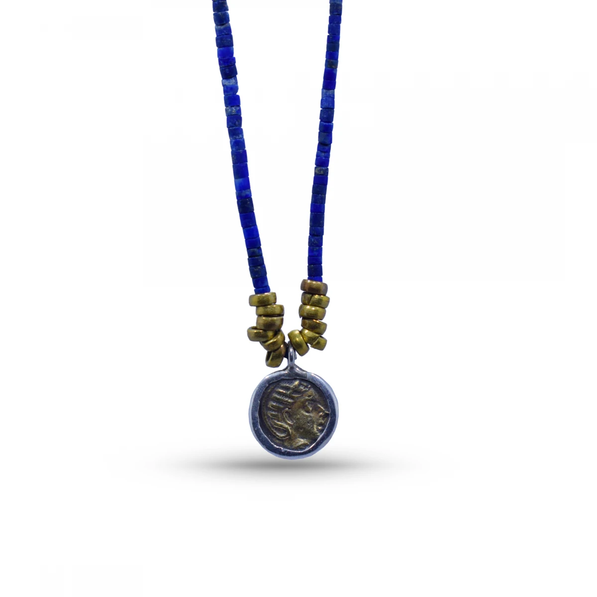 This unique necklace is made of a handmade sterling silver coin pendant. The chain part consists of hand-cut lapis lazuli.