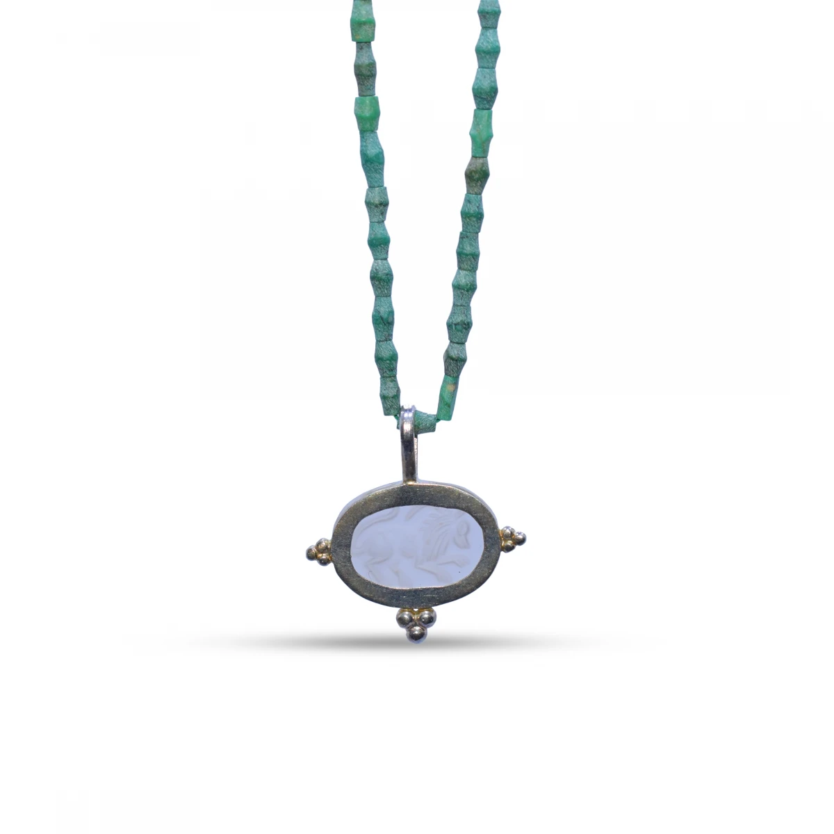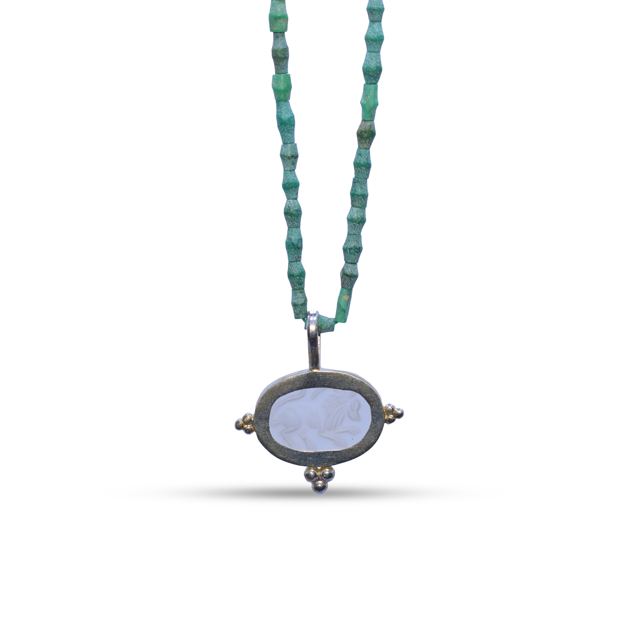 This unique necklace features a quartz carved stone made using the antique lost wax casting technique, hand-molded in sterling silver. The chain is made of hand-cut malachite, making this piece truly one of a kind.