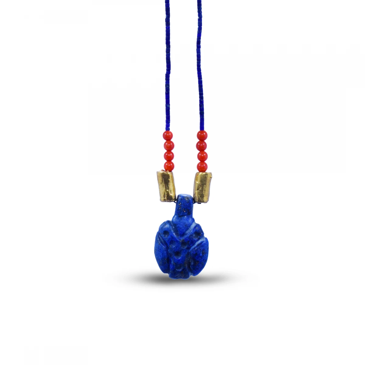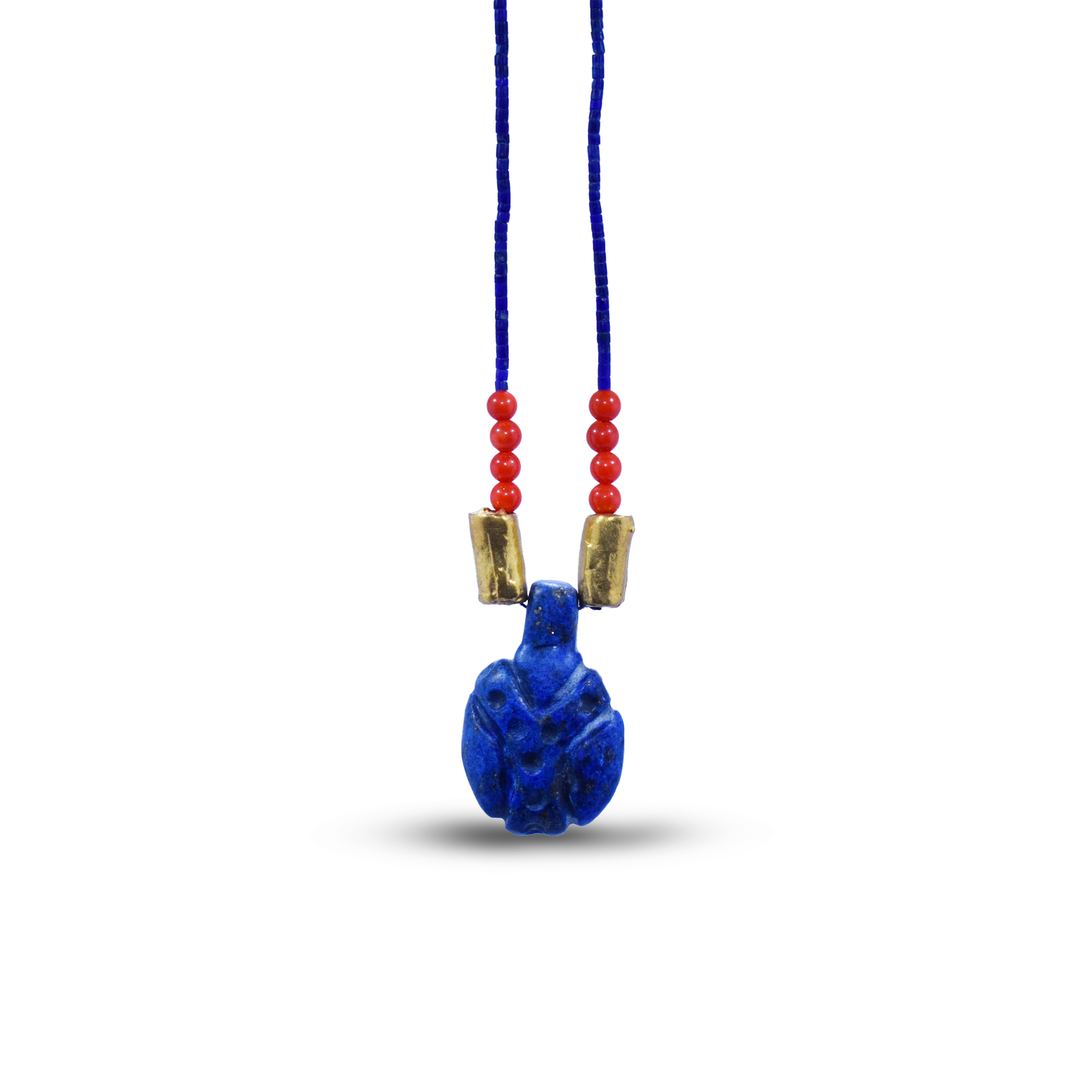 This unique necklace is made of a hand-carved lapis lazuli pendant, antique coral, and handmade bronze pieces. The chain is crafted from cut lapis lazuli.