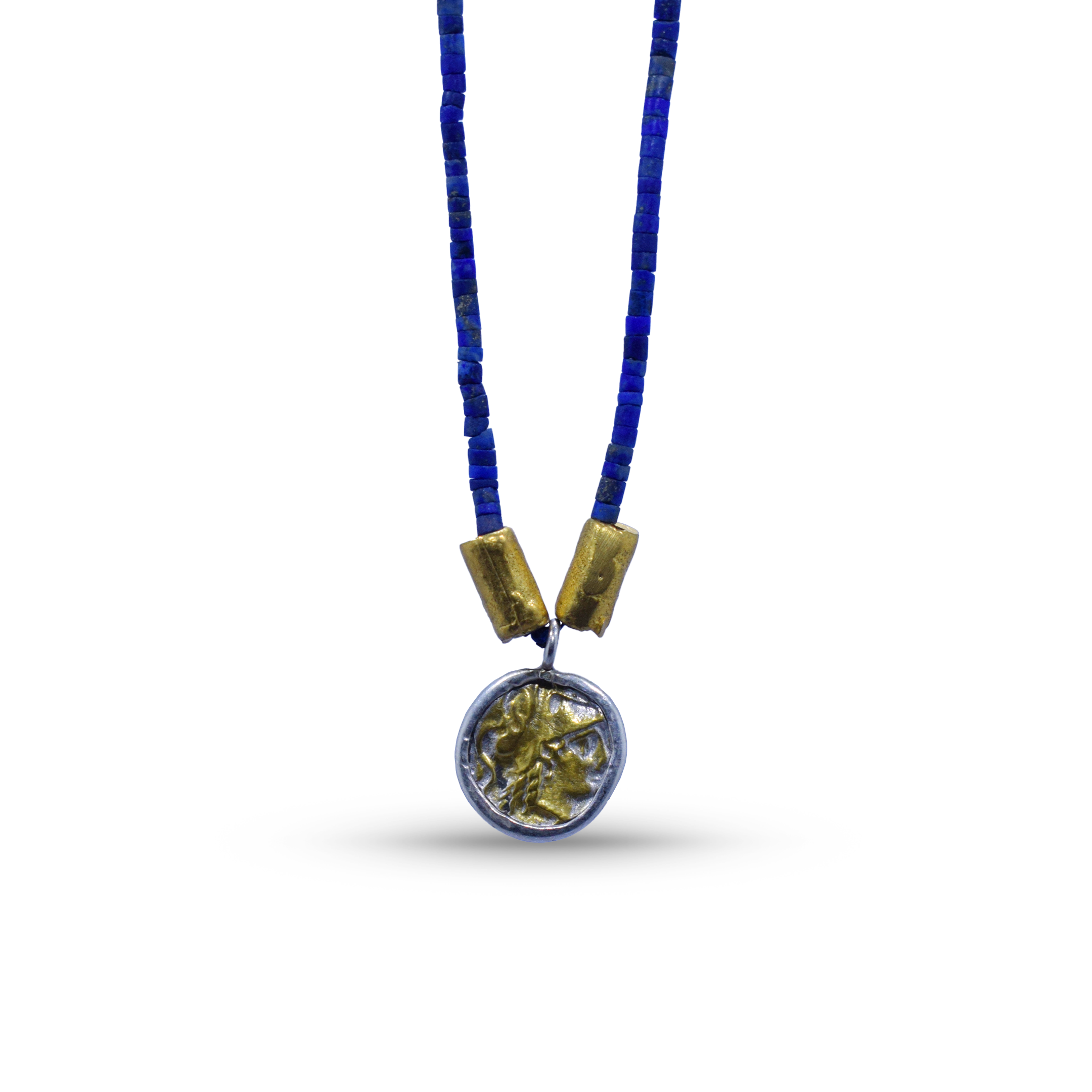 This unique necklace is made of a handmade sterling silver coin pendant. The chain part consists of handmade cut lapis lazuli.