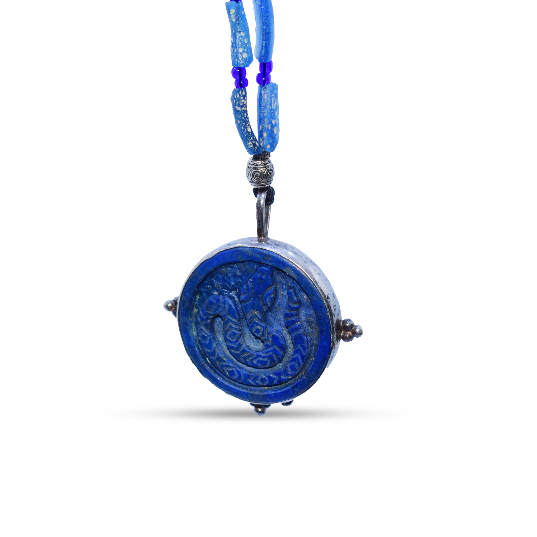 This unique necklace is made from lapis lazuli carved stone using the antique lost wax casting technique, hand-molded in sterling silver. The chain part consists of Roman glass, making this piece truly one of a kind.