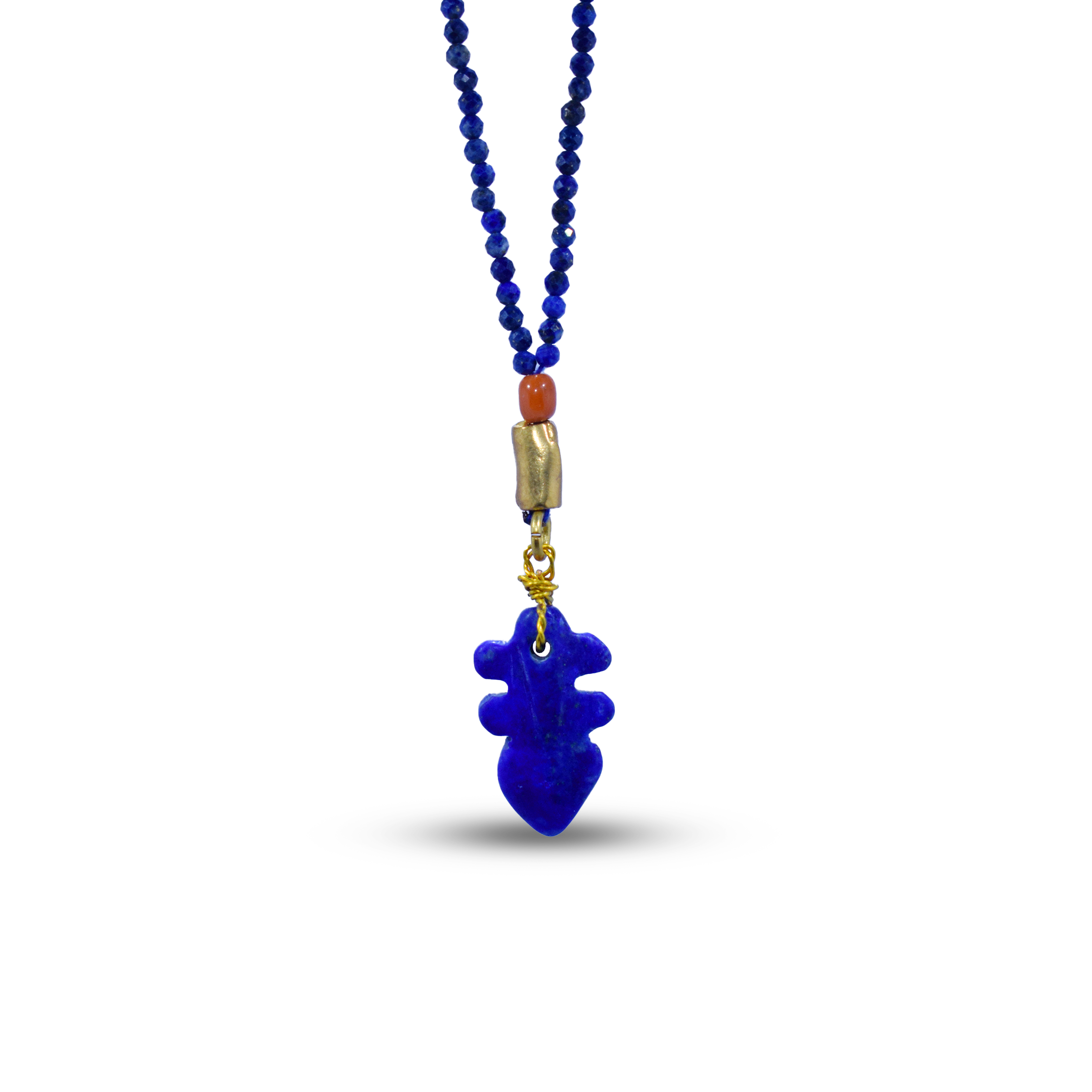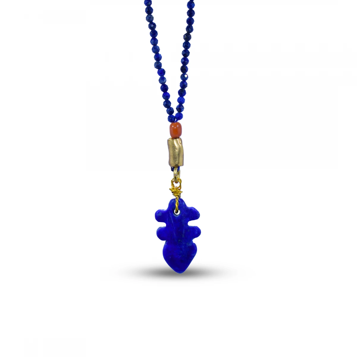 This unique necklace features a hand-carved lapis lazuli pendant, antique coral, and handmade bronze pieces. The chain is made of facet-cut lapis lazuli.