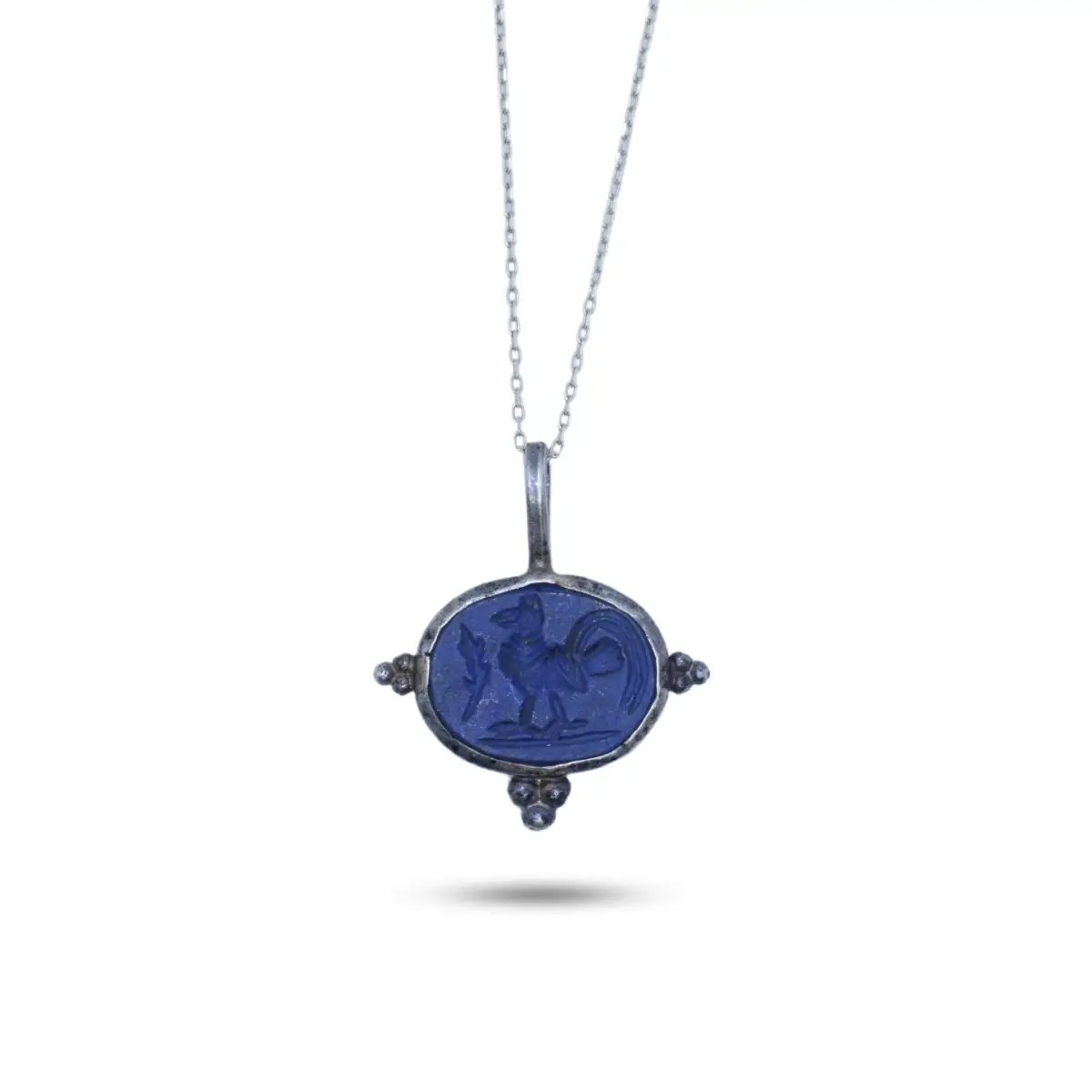 This necklace features a hand-carved cameo in lapis lazuli, elegantly set in hand-molded sterling silver with a silver chain.