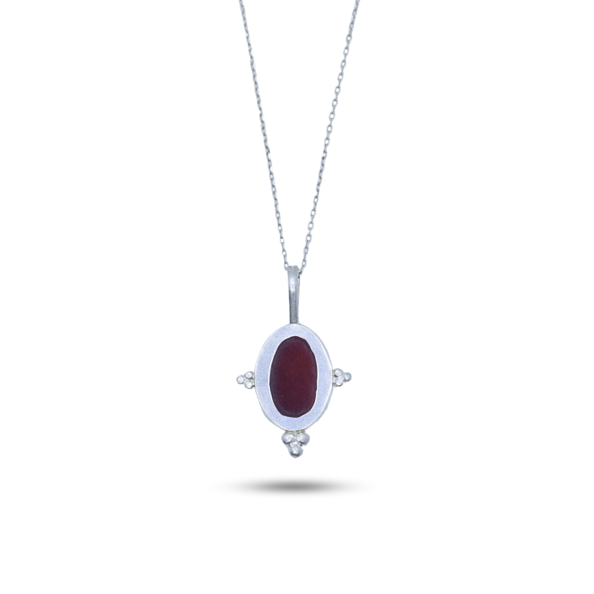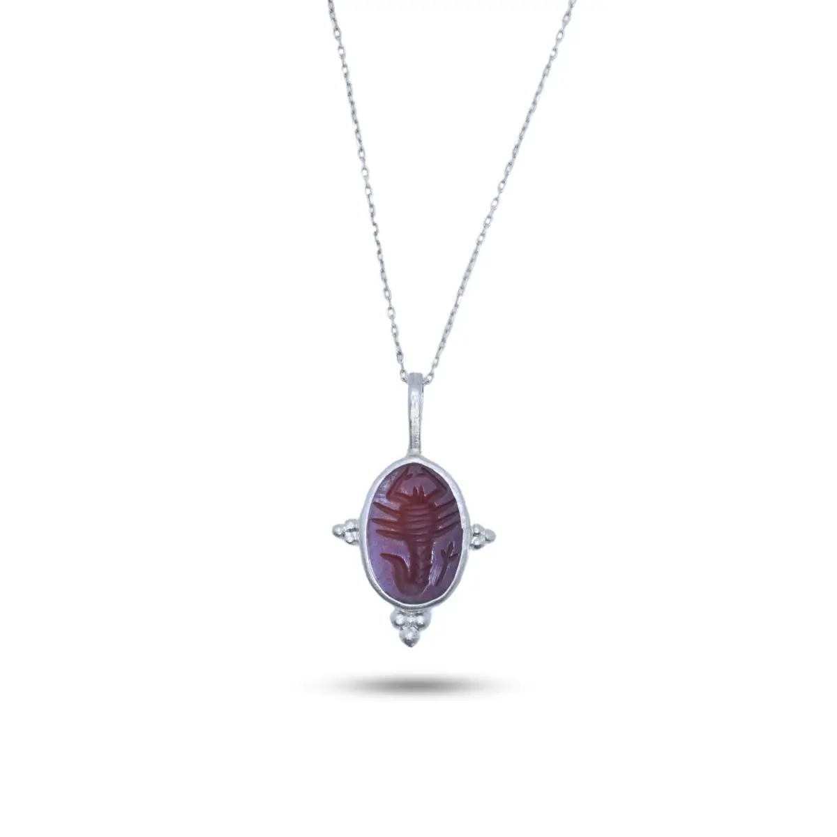Bu kolyede yer alan came teknik, kırmızı akik taşından elle oyulmuştur ve gümüşten elle şekillendirilmiştir. Gümüş zincir kullanılmıştır.