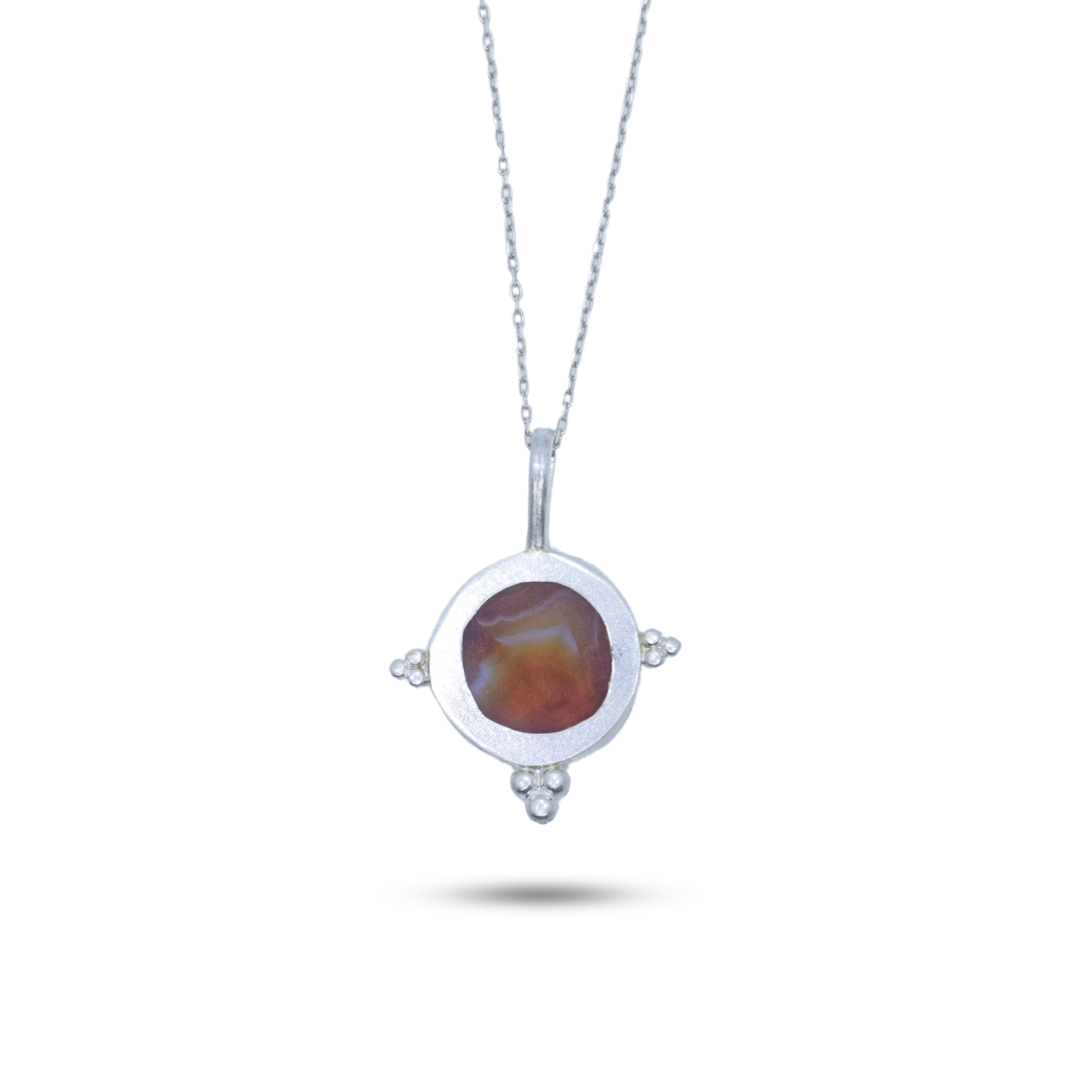 This necklace features a hand-carved cameo in red carnelian, elegantly set in hand-molded sterling silver with a silver chain.